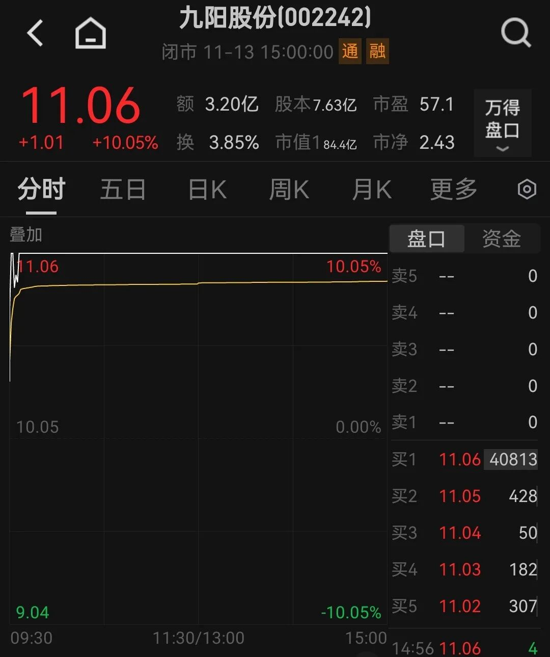 值得一提的是,伴随着“哈基米南北绿豆”豆浆的爆火,11月13日早盘,九阳股份开盘直线拉升,封死涨停,股价报11.06元。