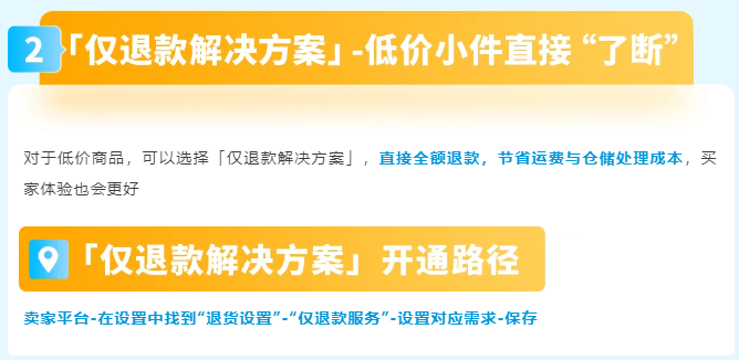 有时即使做了预防,但有些退货还是避免不了。当买家在收到货后仍想退货,这时候使用“仅退款、部分退款解决法”可以有效省掉物流费、仓储费、二次处理费等费用,降低退货成本。