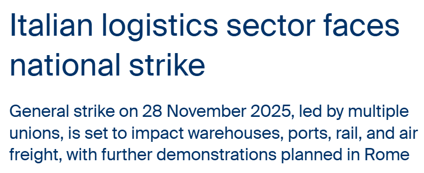 各位跨境“老鸟”卖家朋友们,大家好! 文章的开始先问大家个问题:各位卖家朋友们最近有发往欧洲的货,计划走意大利港口吗?有经过意大利中转的货物吗?如果答案是“YES”,那这篇文章你务必看到最后。 就在这两天,据德迅及多家欧洲当地新闻机构发布的预警:由意大利基层工会联盟(Unione Sindacale di Base)以及意大利工会联合会(CUB)和意大利基层工会联盟(COBAS)等其他意大利基层工会已联合宣布:意大利计划于11月28日(本周五)举行一场24小时全国性的总罢工。这个时间正是黑五旺季销售期间,搞这么一出,真难受啊! 继比利时、墨西哥等国之后,意大利也即将迎来全国性的总罢工。请务必关注此次罢工对您货物运输时效可能造成的影响,特别是发往欧洲站,或经由意大利中转的货物! 罢工时间: 2025年11月28日(但实际上从11月27日晚间起,铁路和高速公路工作人员就已经受到影响) 罢工核心影响范围: 与以往小规模的行业罢工不同,本次罢工预计将席卷意大利全国的物流系统,从港口到本土公路运输到仓储,甚至空运,都将受到冲击。 罢工原因: 工会提出的抗议诉求主要围绕工资要求、养老金制度以及反对2026年预算和外交政策。 https://work.weixin.qq.com/ca/cawcde127064cc54f7 ▲复制链接浏览器打开获取【欧美FBA&海外仓一件代发】报价 此次罢工预计意大利四大主要港口运营或将停摆,它们分别是: ● 热那亚港(Genoa): 意大利最大的港口,地中海第二大港,是许多输往欧洲内陆货物的重要中转站。 ● 的里雅斯特港(Trieste): 位于亚得里亚海,是连接中欧和东欧的重要枢纽。 ● 利沃诺港(Livorno): 意大利西海岸的主要港口之一,处理大量集装箱。 ● 奇维塔韦基亚港(Civitavecchia):- 罗马的主要港口,是商业和渡轮运输的关键节点。 一旦罢工开始,这些港口的集装箱装卸、货物进出港、仓储作业等一系列流程都将面临中断或延误。 意大利全国铁路服务暂停24小时。根据意大利交通部的公告,全国铁路服务将于11月27日晚21:00至11月28日晚21:00期间,暂停整整24小时。 这意味着: ● 货物中转受阻: 依赖“海铁联运”模式进入意大利内陆的货物,将面临至少一天的停滞。 ● 尾端派送延误: 铁路停运将导致货物积压,即便罢工结束,后续的线路调整和运力恢复也需要时间,可能引发连锁延误。 公路运输网络面临拥堵风险。除了海运和铁路,公路运输同样无法幸免。 据悉,负责高速公路收费、维护及应急支持的人员,也将于11月27日晚22:00至28日晚22:00期间停止工作。 人员的减少可能导致关键收费站出现拥堵,尤其是在繁忙的南北工业货运线路上。对于需要卡车派送的尾程物流来说,时效性将大打折扣。 旺季之路,关卡重重。意大利罢工仅持续24H,预计不会对物流时效造成太大影响,如果不放心可以通过提前规划在原有物流时效基础上预留2-3天缓冲时间,以防出现断货风险。如果你的货物正好处在尴尬的节点上,欢迎随时来找我们聊聊。祝各位卖家朋友们旺季大卖!
