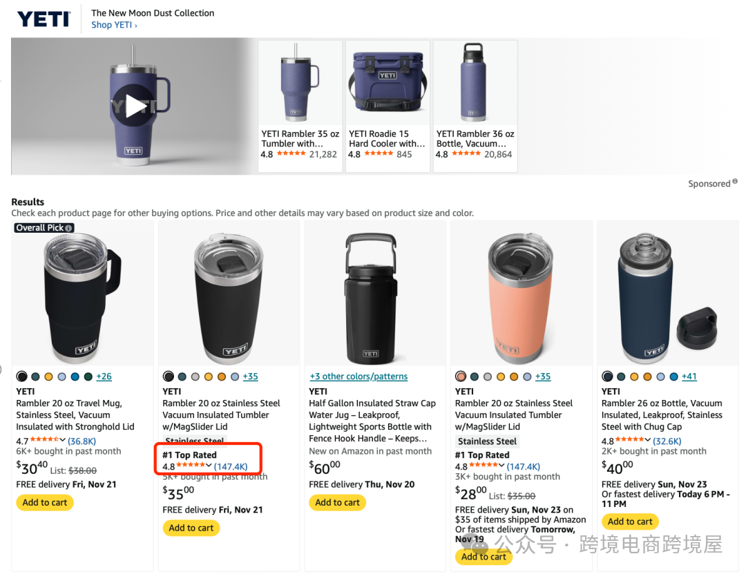 Yeti旗下的Rambler水杯,是亚马逊水杯类目的顶流品牌之一,热销单品拥有超过14万评论,是亚马逊在该类目的#1 Top Rated产品。