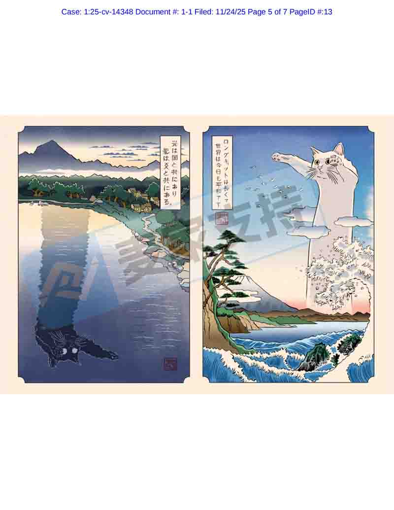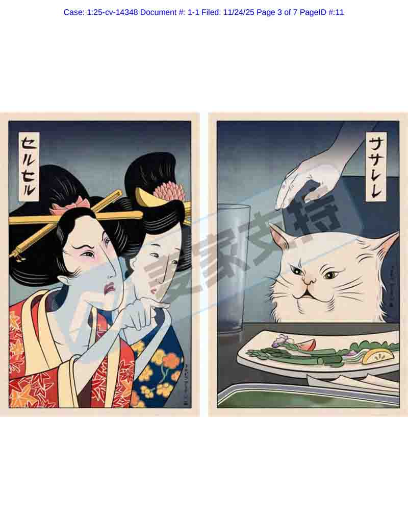 本案是keith律所代理美国艺术家Griffin Waldau 发起的版权维权案件,本案共涉及VA 2-387-366、VA 2-453-755和VA 2-454-557等三个版权作品,均于2025年5月16日获得美国版权认证。Griffin Waldau以Ukiyomemes为笔名在网络上创作并发布作品,并被广泛用于装饰画、T恤、水杯、贴纸等商品,跨境卖家需注意排查避雷,避免陷入TRO冻结风险。关注我们,后续可持续跟进案件后续进展!