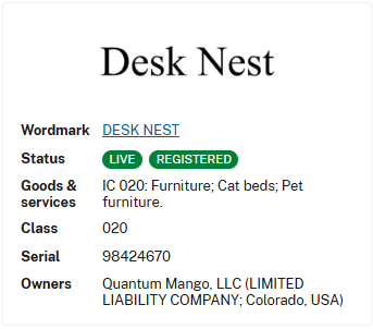 维权产品DESK NEST猫窝是原告旗下的最新产品,首款专为安装在书桌上设计的猫窝,旨在让小型宠物靠近主人而不干扰主人工作,已有38家店铺被告。