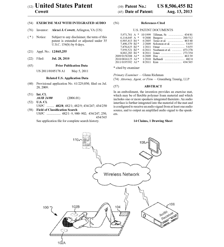 专利名称Exercise mat with integrated audio,专利号US8506455B,2010年7月28日申请,2013年8月13日下证,类似原理或结构均有侵权风险,无论外观是否相同,有卖相关产品的需注意排查: