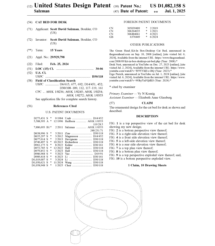 专利侵权则涉及名为Cat bed for desk的美国外观专利,专利号USD1082158S,2024年2月25日申请,2025年7月1日下证: