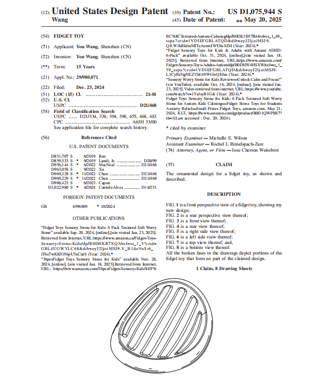 涉案专利二:专利名称FIDGET TOY,专利号USD1075944S,2024年12月23日申请,2025年5月20日下证