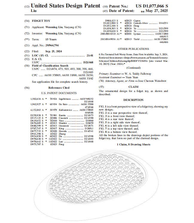 涉案专利一:专利名称FIDGET TOY,专利号USD1077066S,2024年9月25日申请,2025年5月27日下证