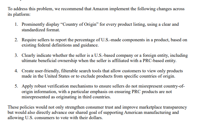 信中提出五项具体建议,建议亚马逊在其平台上实施以下变更: