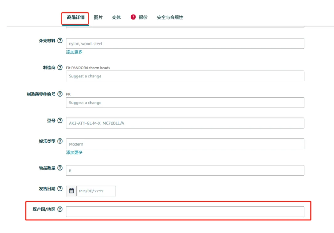 对于少量的sku,卖家可以在产品编辑页面的“原产国/地区” 字段进行添加。