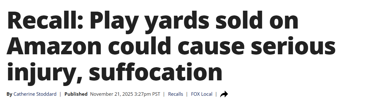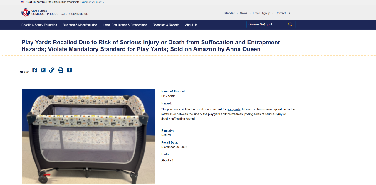 近日,美国消费品安全委员会(CPSC)紧急召回由Anna Queen在亚马逊销售的婴儿游戏围栏(Play Yards)。该产品因违反联邦强制性安全标准,存在窒息和夹困风险,可能导致婴幼儿严重伤害甚至死亡。