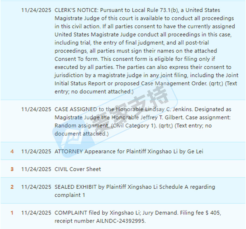 本案是Getech Law LLC代理国人产品设计师Xingshao Li发起的外观专利维权案件,目前该案件处于密封状态,但麦家支持通过排查发现,原告名下注册有专利号为D1052361的一款巧克力棒模具,并于2024年11月26日获得美国外观专利认证。目前该案件处于前期立案阶段,暂未获批TRO临时限制令,跨境卖家需注意排查避雷!
