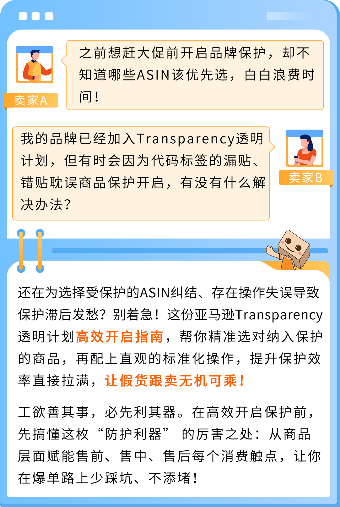 (2)保护效果: 商品详情页获得正品标识“小蓝标”,帮助新品快速建立信任,提升转化。亚马逊研究显示,加入 Transparency 透明计划保护的品牌平均实现5-10%的销量增长*!