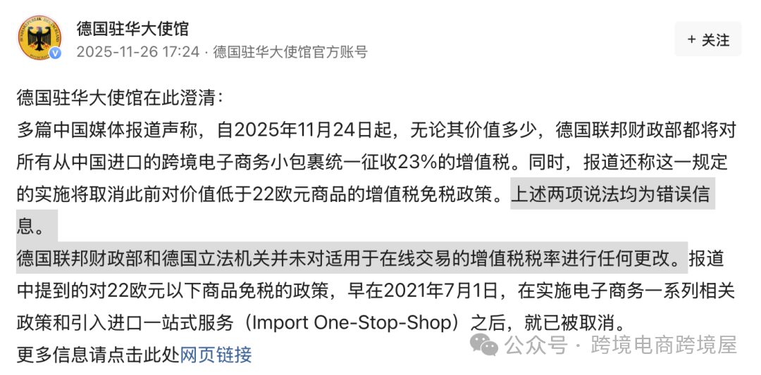 11月26日,德国驻华大使馆官方账号发布信息,上述两项说法均为错误信息。德国联邦财政部和德国立法机关并未对适用于在线交易的增值税税率进行任何更改。