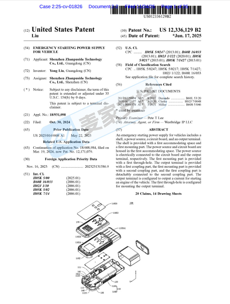 本案是Bochner律所代理国人卖家Shenzhen Zhanpusida Technology Co., Ltd.,针对其于2025年6月17日获得美国专利认证的两个车辆应急启动电源发明专利被侵权的行为,发起的专利维权案件;涉案专利号为:12336125和12336129。本案从原告公布的名单来看,共有6店涉案,目前案件处于前期立案阶段,暂未获批TRO临时限制令,跨境卖家需注意排查避坑!
