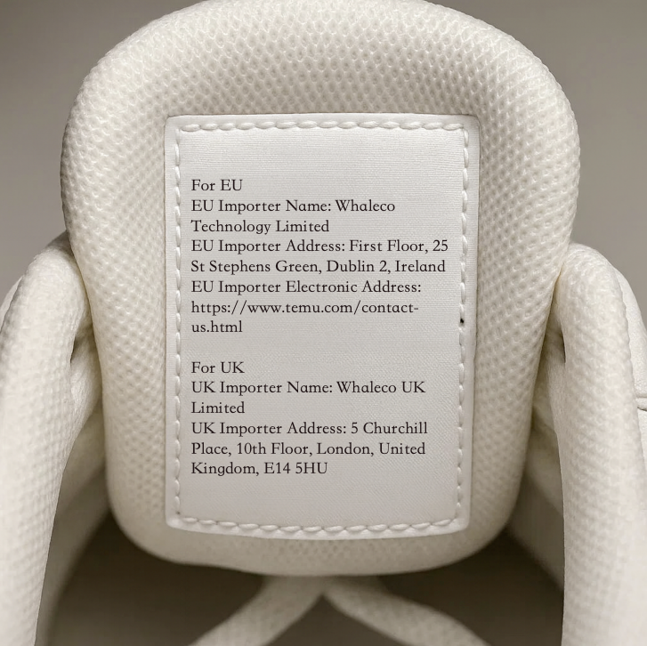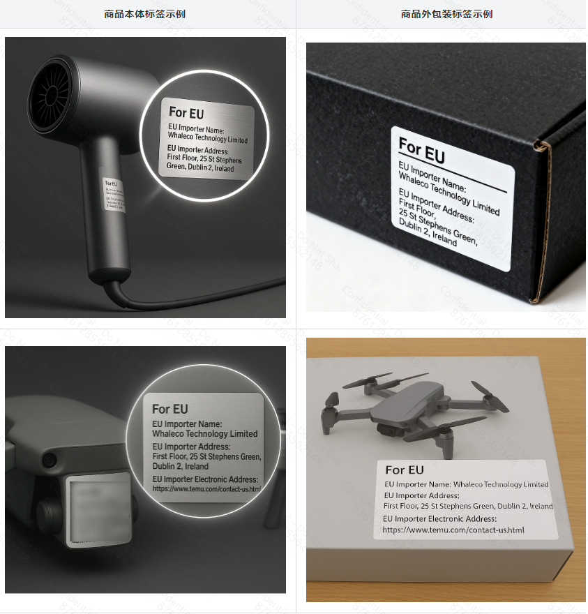 根据欧盟法规要求,需要在商品本体上展示进口商名称、邮政地址信息和电子地址信息(如适用)。如无法直接标注在商品上,则应标注在商品包装上或随附文件中。欧盟进口商信息的展示内容如下: For EU EU Importer Name: Whaleco Technology Limited EU Importer Address: First Floor, 25 St Stephens Green, Dublin 2, Ireland EU Importer Electronic Address: https://www.temu.com/contact-us.html 注意: 如上所示的进口商名称与地址信息,应完整、清晰地在商品本体上展示,不可随意更改。 根据欧盟蓝色指南,如果需要拆开商品的初级包装才能在商品本体上展示进口商信息,属于“无法直接标注在商品上”的情形。适用情况下,请直接在商品包装上展示进口商信息。 适用的销售目的国家/地区是欧盟以及英国北爱尔兰地区。 若商品属于GPSR、无人机法规、建筑产品法规、机械产品法规、电池法规范围内的商品,则需要标注进口商的电子地址信息。 请注意:以上示例图仅用于说明该标签信息的展示方式和内容,示例仅供参考。您最终上传的实拍图必须在真实环境中拍摄,并清晰展示完整且准确的信息。 根据英国法规要求,需要在商品本体上展示进口商名称和邮政地址信息。如无法直接标注在商品上,则应标注在商品包装上或随附文件中。大不列颠地区进口商信息的展示内容如下: For UK UK Importer Name: Whaleco UK Limited UK Importer Address: 5 Churchill Place, 10th Floor, London, United Kingdom, E14 5HU 注意: 如上所示的进口商名称与地址信息,应完整、清晰地在商品本体上展示,不可随意更改。 如果无法在商品本体上展示进口商信息,请在商品包装上标注如上英国进口商信息。 适用于销售目的地为英国大不列颠地区(英格兰、苏格兰、威尔士) 请注意:以上示例图仅用于说明该标签信息的展示方式和内容,示例仅供参考。您最终上传的实拍图必须在真实环境中拍摄,并清晰展示完整且准确的信息。 可以参考如下格式,若商品属于GPSR、无人机法规、建筑产品法规、机械产品法规、电池法规范围内的商品,需要标注进口商的电子地址信息。 For EU EU Importer Name: Whaleco Technology Limited EU Importer Address: First Floor, 25 St Stephens Green, Dublin 2, Ireland EU Importer Electronic Address: https://www.temu.com/contact-us.html For UK UK Importer Name: Whaleco UK Limited UK Importer Address: 5 Churchill Place, 10th Floor, London, United Kingdom, E14 5HU 1. 若商品属于GPSR、无人机法规、建筑产品法规、机械产品法规、电池法规范围内的商品,则需要标注进口商的电子地址信息,请参考如下模式: For EU EU Importer Name: Whaleco Technology Limited EU Importer Address: First Floor, 25 St Stephens Green, Dublin 2, Ireland EU Importer Electronic Address: https://www.temu.com/contact-us.html 2. 若商品不属于以上范围,则无需要标注进口商的电子地址信息,请参考如下模式: For EU EU Importer Name: Whaleco Technology Limited EU Importer Address: First Floor, 25 St Stephens Green, Dublin 2, Ireland 可通过水洗唛或其他适当的形式展示,水洗唛的参考示例如下: 不可以,展示本文的进口商信息,并非为了替代欧代或制造商信息,而是在已有信息基础上的额外新增。 正确操作:在展示本次进口商的同时,欧代和制造商等信息仍需一并完整展示。 错误操作:某商家直接将制造商信息替换为本文的进口商信息。 您只需直接使用示例中的英文内容,确保内容完全一致,无需自行编辑或修改进口商信息。 初级包装,也常被称为内包装或销售包装,是指与商品直接接触、用于盛装、包裹和保护商品的最基本形式的包装。例如: 以上内容来源Temu卖家课堂。