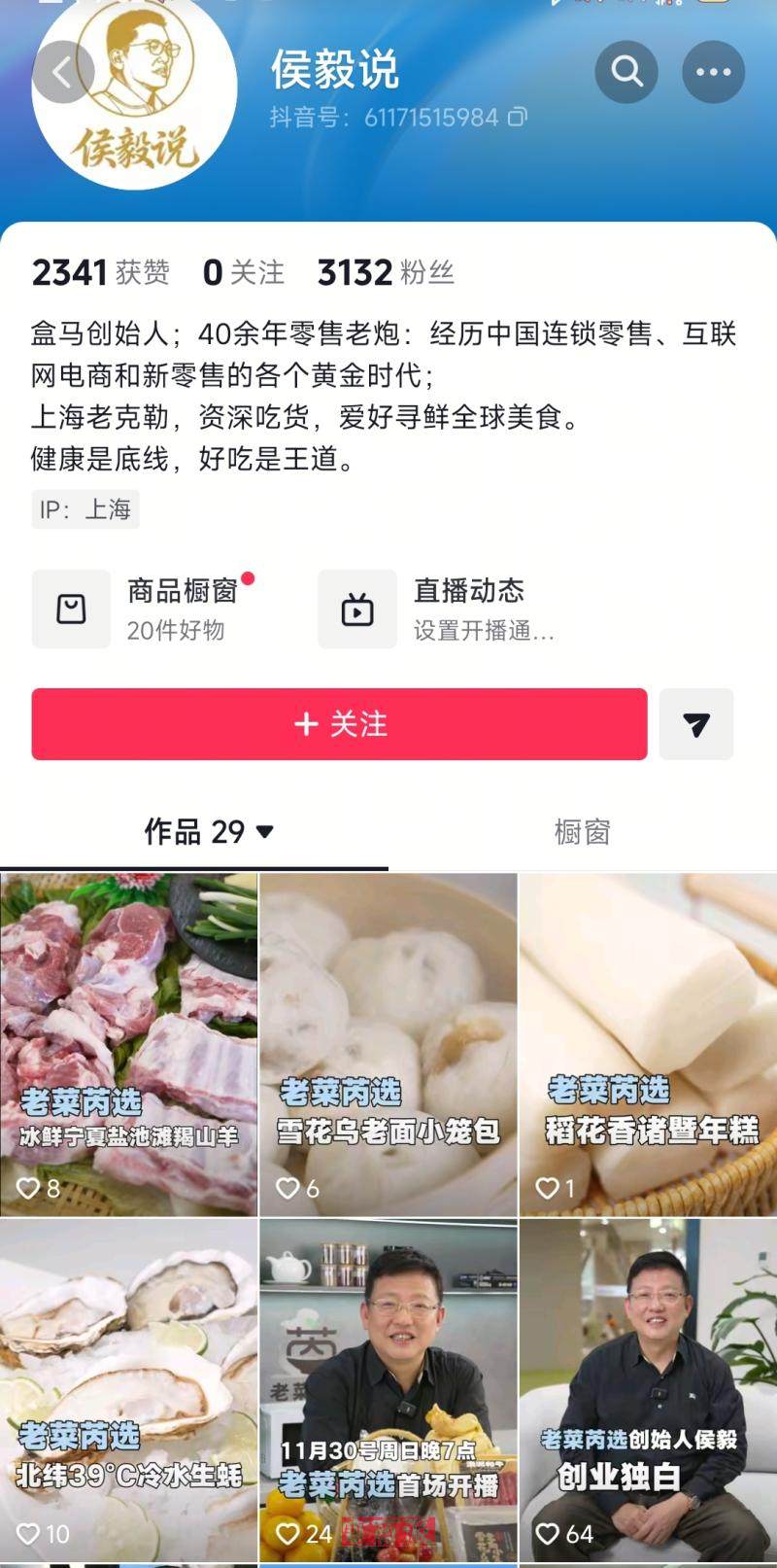 原盒马鲜生CEO侯毅推出“老菜芮选”,进军直播带货领域。