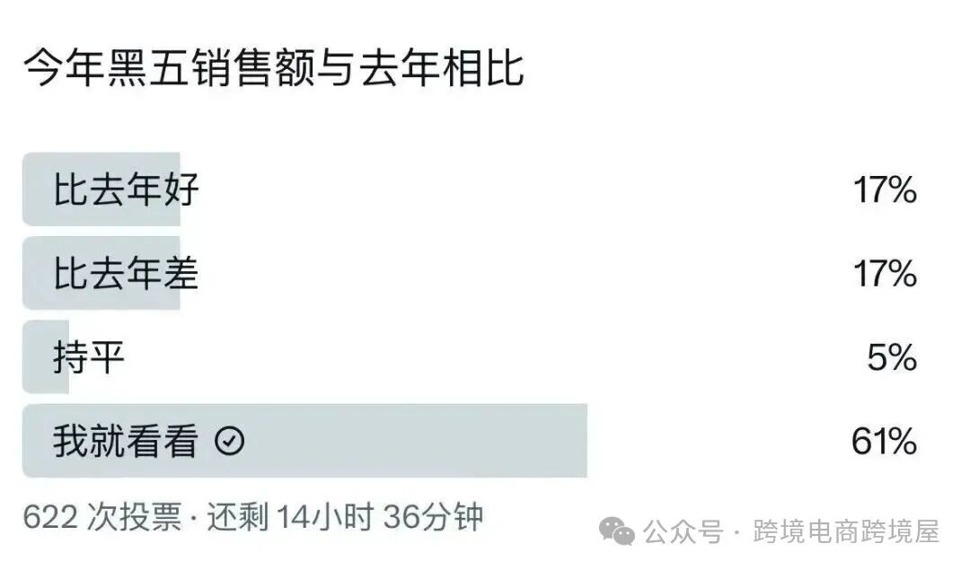 有卖家发出了黑五销售额业绩统计,超过600个投票中,比去年好和比去年差各占17%,持平占5%。总体来看,卖家表现基本跟去年是持平的。