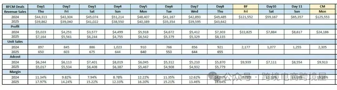 在价格方面,不少卖家今年都没有疯狂降价。一位年销售额8位数美金的大卖Michael分享了今年大促开始到感恩节当天的销售及利润数据。这个黑五的前置档期,他采取了适当的提价策略,并减少了促销,因此销售数量有所减少,导致店铺营收下降约14%。但是,由于提价和减少了PPC广告支出,利润最终反而增长约17%,毛利率从11%升至15.4%。