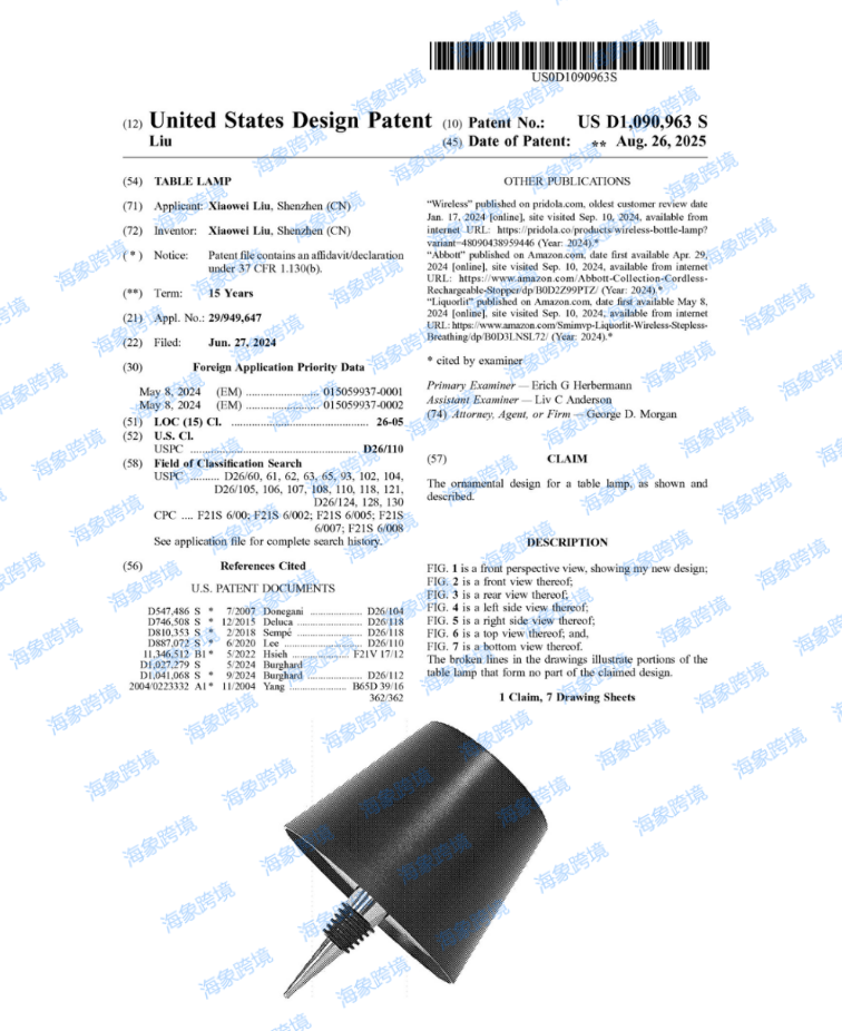 案件参数 起诉时间:2025/11/21 案件号:25-cv-14238 原告品牌:瓶塞台灯专利 品牌方:Xiaowei Liu 起诉地:美国伊利诺伊州 注册专利: 本案为国人原告,案件信息为隐藏状态,小编查询到原告名下有以下专利信息。该专利产品是一款瓶塞台灯,可以放置到瓶子顶部,将任何空瓶变成优雅的照明装饰品。 代理律所介绍: Alioth Law LLP成立于2024年,总部位于美国加利福尼亚州;是一家专注于跨境法律服务的律师事务所,拥有一支精通美国和中国法律的专业团队,其业务范围涵盖多个领域:知识产权、房地产、公司治理、跨境交易等。 刊登实例: