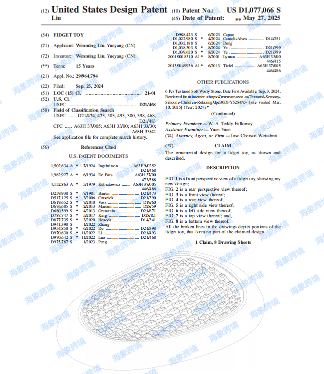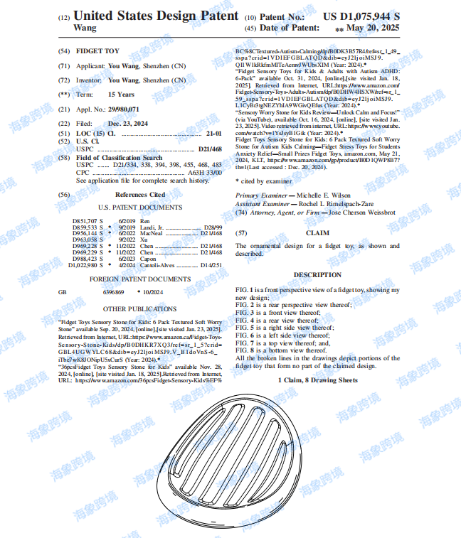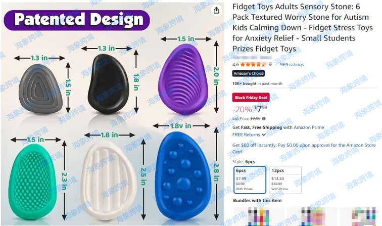 ●案件参数: 起诉时间:2025/9/24 案件号:25-cv-2574 原告品牌:指尖减压玩具 品牌方:Shenzhen Lesheng Industrial Co., Ltd. 起诉地:美国佛罗里达州 注册专利: 本案为国人原告,案件信息为隐藏状态,经小编了解案件涉及以下专利。专利产品是两款指尖玩具,反复用手指上下摩擦这些纹理丰富的感官石,可以帮助舒缓压力,请相关卖家注意排查避雷! 刊登实例: