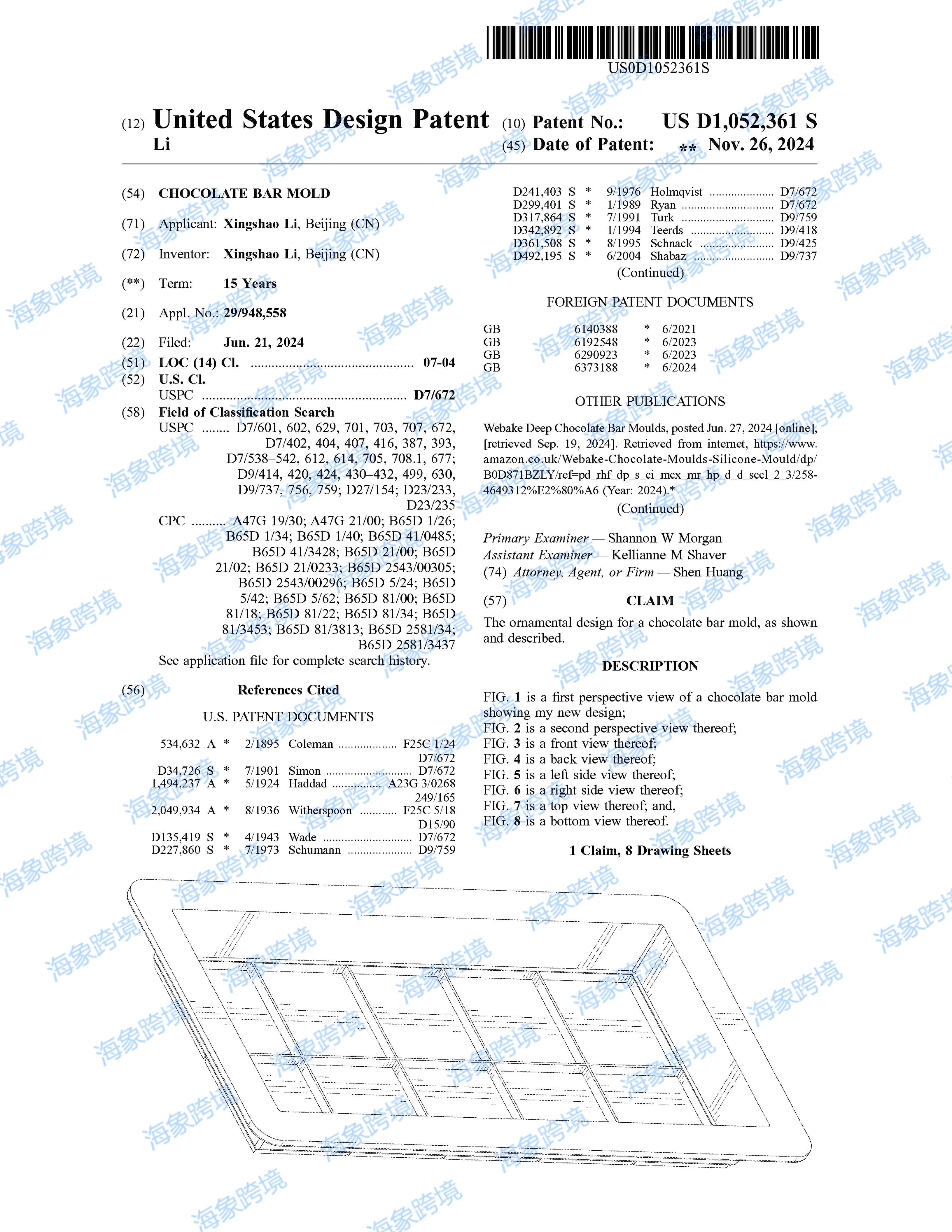●案件参数: 起诉时间:2025/11/24 注册专利: 本案为国人原告,案件涉及专利产品是一款巧克力棒模具。非常适合自制巧克力,可以将自己喜欢的坚果、果酱或其他零食填入模具中,打造独一无二的巧克力棒。