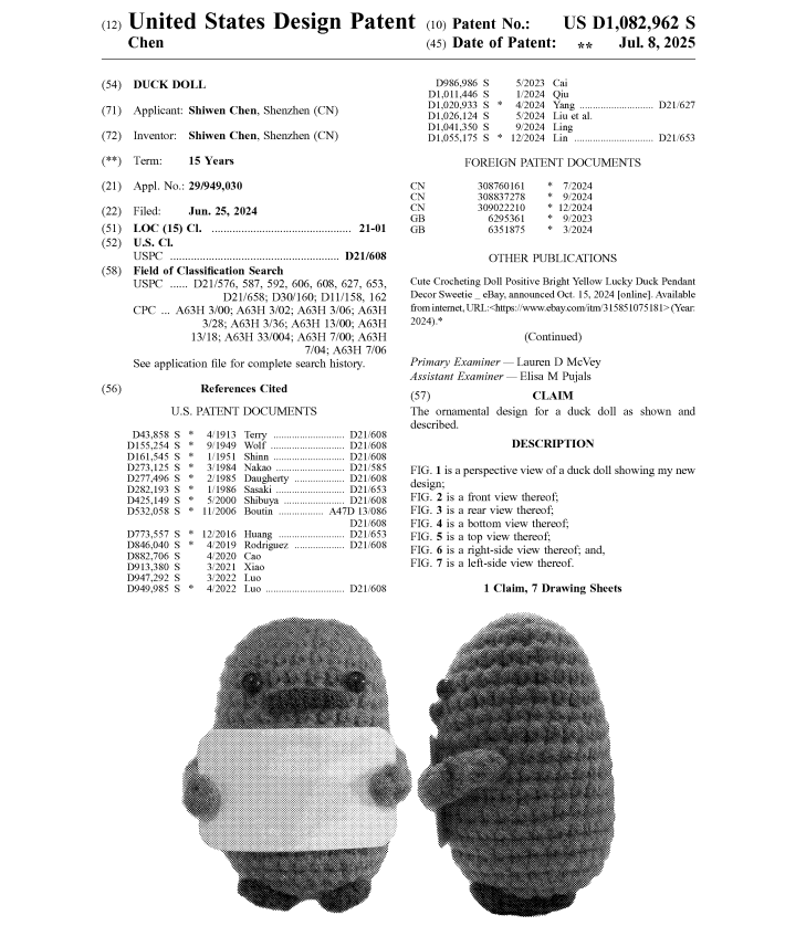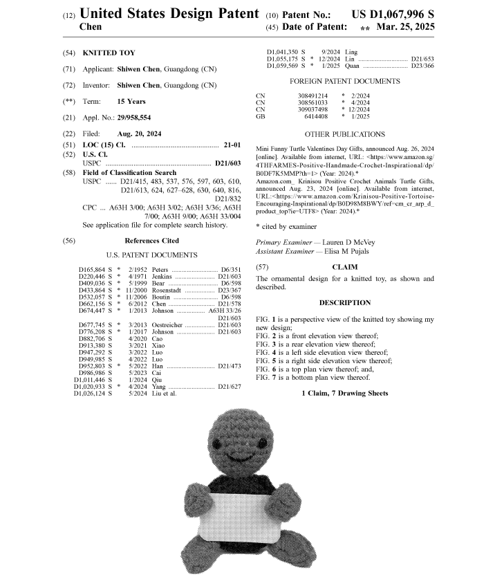 主要涉及两件针织玩具美国外观专利,专利号分别为USD1067996S、USD1082962S,针织玩具的卖家切勿销售与之高度相似的产品: