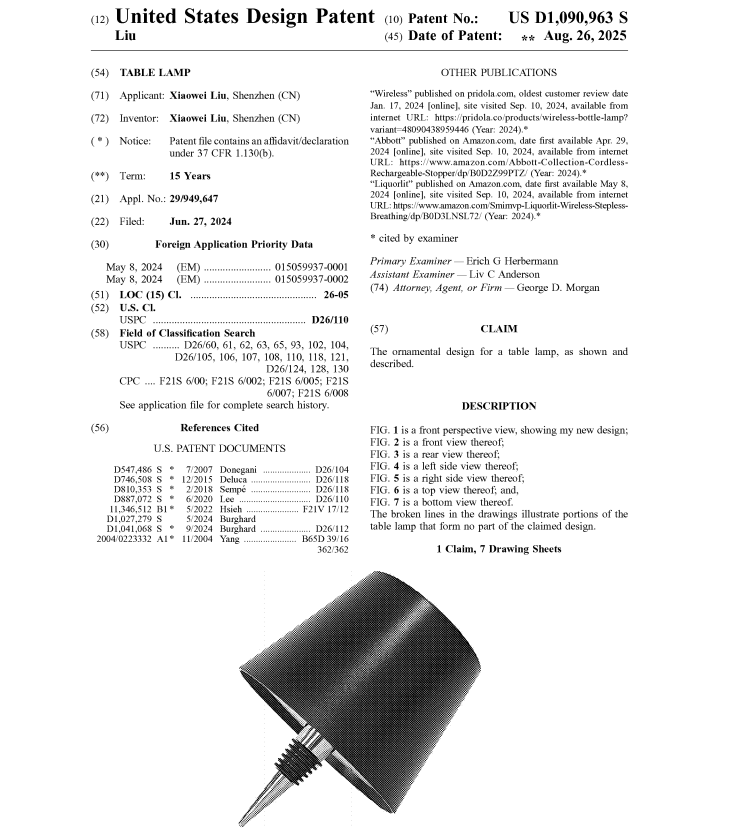 涉及名为Table lamp的美国外观专利,专利号USD1090963S,2024年6月27日申请,2025年8月26日下证: