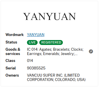YANYUAN美国商标注册在14类珠宝钟表,商标号6564395,有卖相关产品的未经授权切勿擅用: