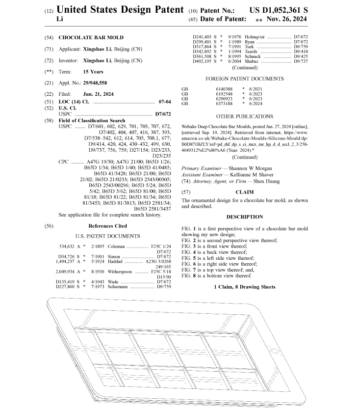 涉及名为Chocolate bar mold的美国外观专利,专利号USD1052361S,2024年6月24日申请,2024年11月26日下证: