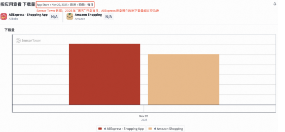 图:“黑五”开卖首日,速卖通欧洲下载量超过亚马逊,来自Sensor Tower