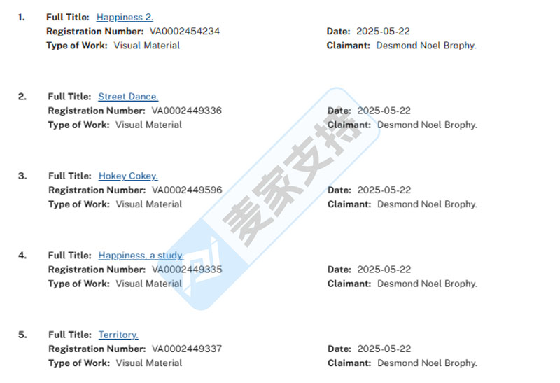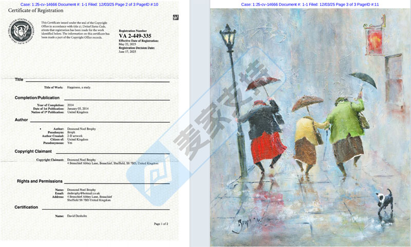 本案是英国艺术家Desmond Noel Brophy委托keith律所发起的版权维权案件,原告于2025年5月22日在美国获得了五个版权认证,本次案件仅针对版权号为:VA 2-449-335的幸福作品发起了维权。跨境卖家在排查避雷时还需警惕其创作的街舞、Hokey Cokey以及领土等版权作品的侵权问题,避免被后续TRO连环维权案件波及!关注我们可持续跟进案件进展,及时做出应对措施!