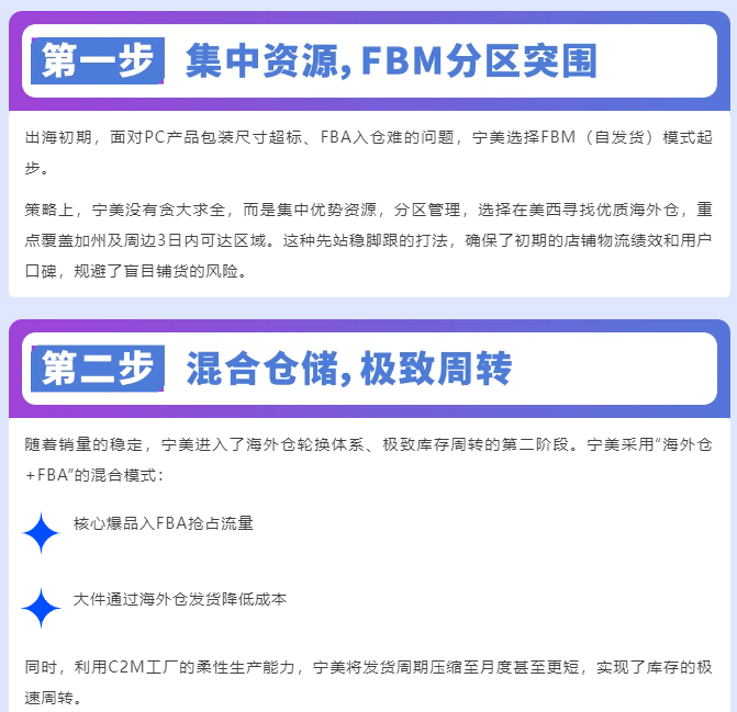 作为工贸一体的卖家,宁美没有盲目扩张,而是通过一套供应链三步走的策略,逐步解决了时效、仓储和成本等难题。