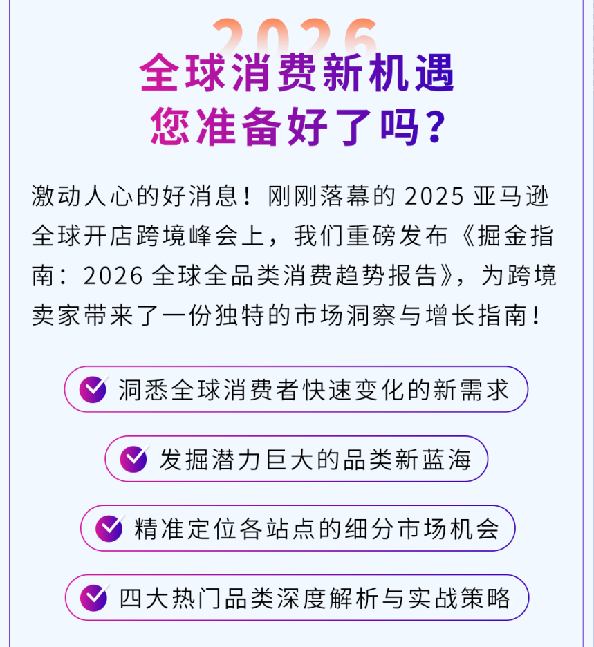 20大消费趋势重磅解析:将美、欧、日站点20大消费趋势一网打尽,深度解读不同市场的购物偏好。无论是想深耕老品类做升级,还是开拓新品类找切口,都能助您找到清晰指引!