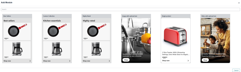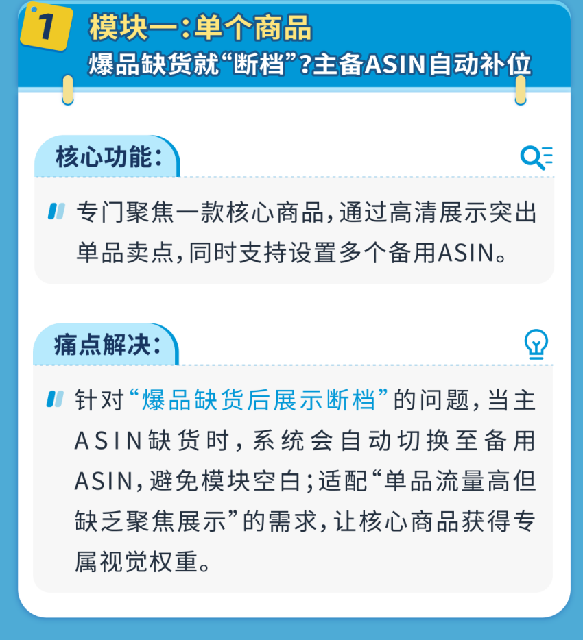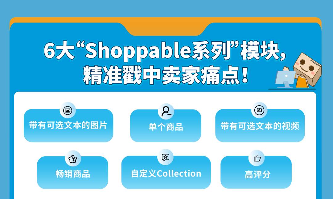 “Shoppable系列”的6大核心模块,针对卖家在商品展示、流量转化、关联销售等场景的核心痛点,提供相应的解决方案。每个模块均支持直接跳转至商品详情页或品牌旗舰店,搭配灵活的配置逻辑,全方位适配“内容驱动、兴趣导向”的购物趋势,助力卖家高效盘活流量、提升转化。