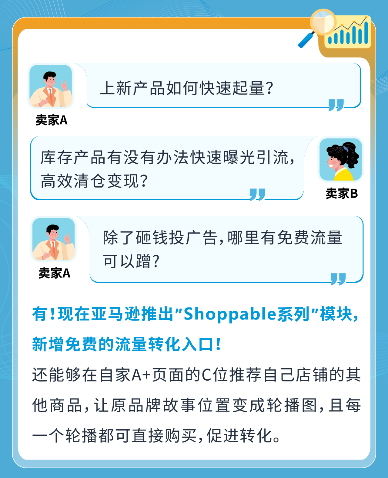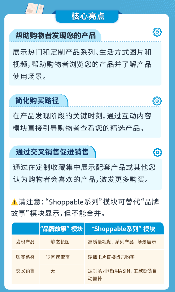 适用卖家:完成品牌注册且可使用A+页面的卖家,可在A+页面设置中查看是否已有“Shoppable系列”模块