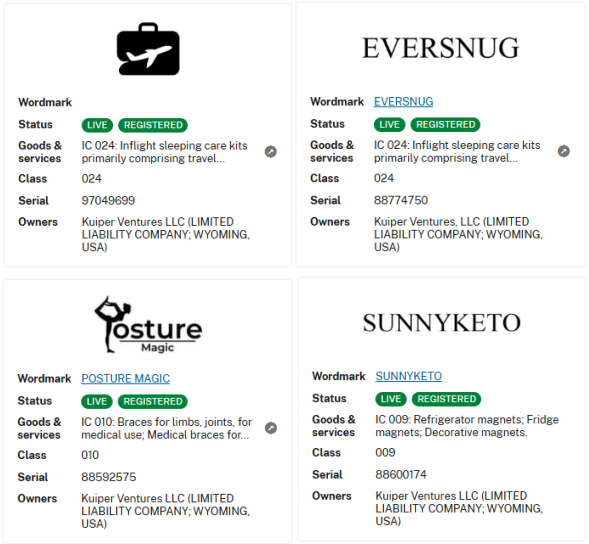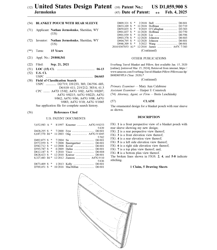 专利侵权则涉及名为Blanket pouch with rear sleeve的美国外观专利,专利号USD1059900S,2021年9月21日申请,2025年2月4日下证: