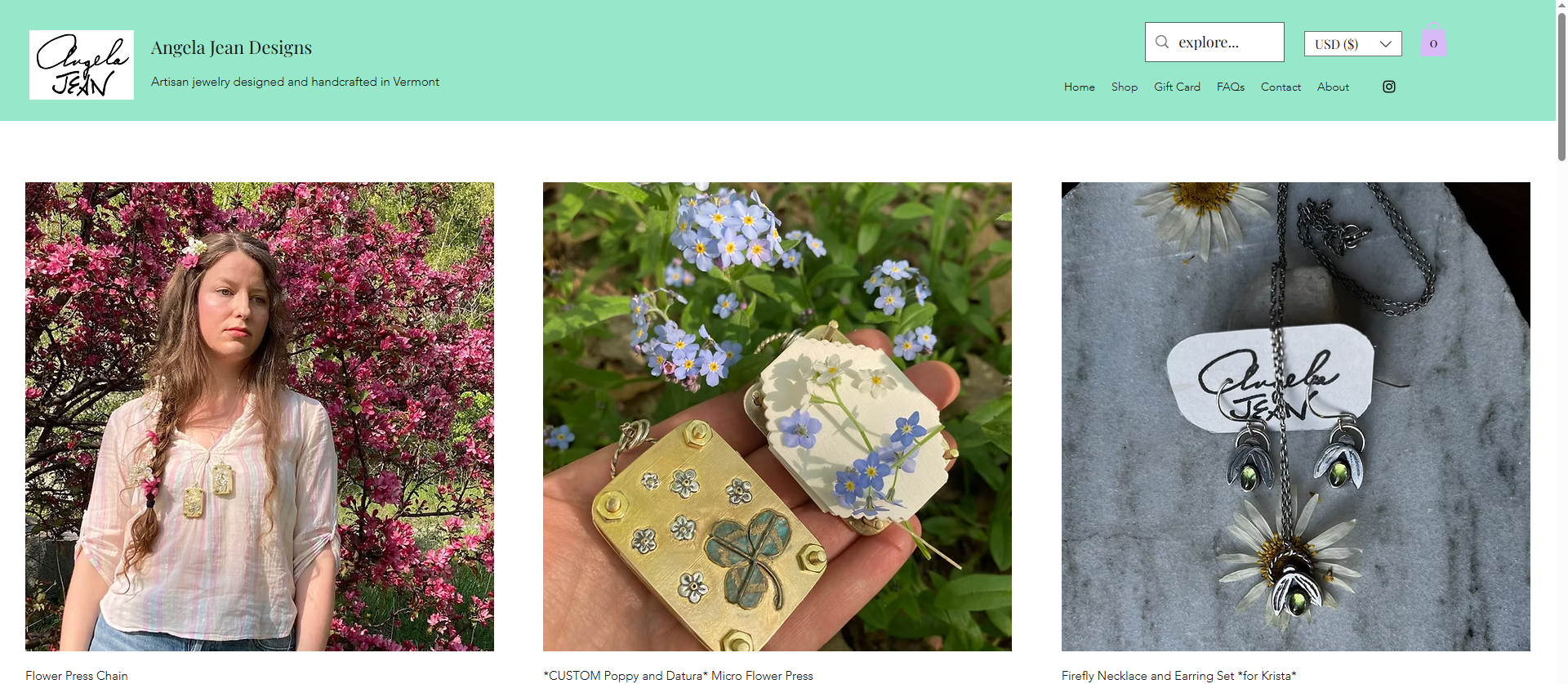 Angela Jean Talbert自2015年起以Angela Jean Designs创作植物首饰及其他珍品,灵感源于植物学、草药医学及佛蒙特州的乡村风光,有自己的独立站和esty店铺。