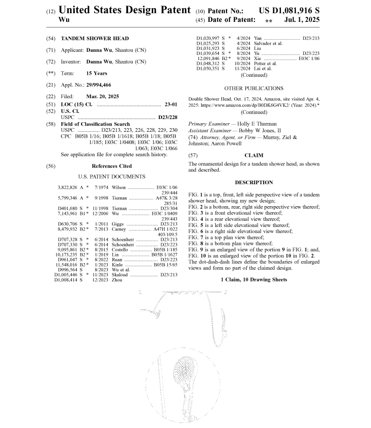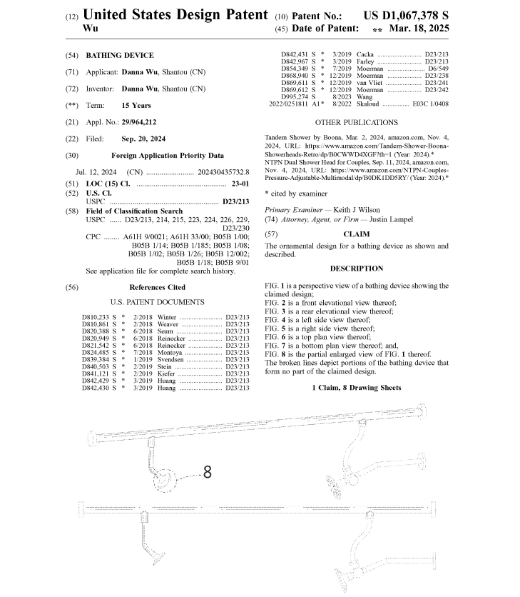涉及两件美国外观专利,专利号USD1067378S、USD1081916S,有卖淋浴装置的卖家需注意规避,不要销售与之高度相似的产品:
