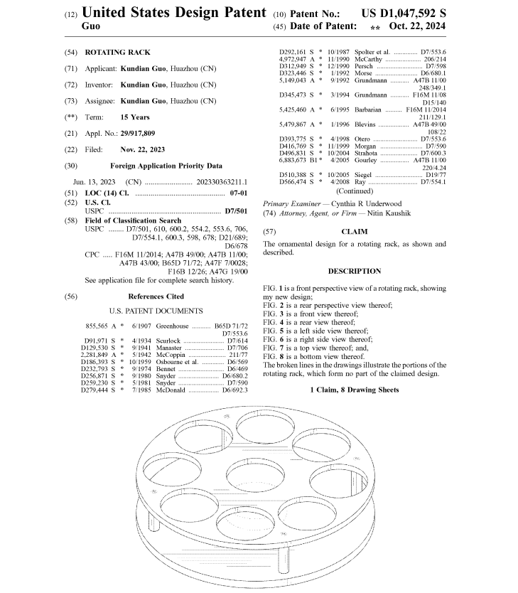 涉及名为Rotating rack的美国外观专利,专利号USD1047592S,2023年11月22日申请,2024年10月22日下证: