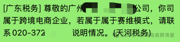 这次短信内容如下:尊敬的广州******公司,你司属于跨境电商企业,若属于属于赛维模式,请联系020-372*****说明情况。