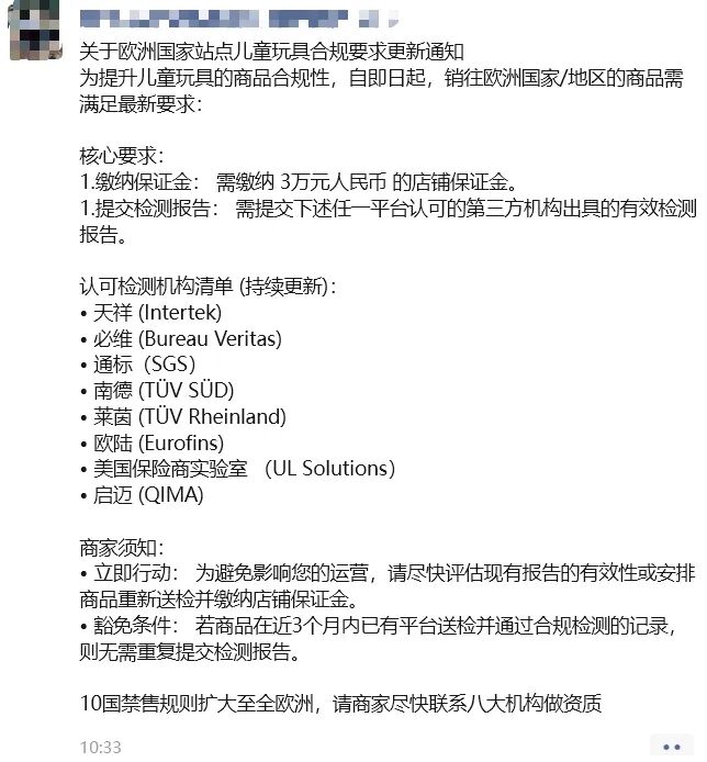 正常检测周期在15~30天,对还没准备的卖家来说时间已经很紧凑。从2026年1月1日起,平台将取消加白和保证金过渡政策,卖家必须上传指定机构的报告才能继续售卖。如果短期无法拿到报告,保证金会在原基础上再加2万,也就是要交5万保证金。