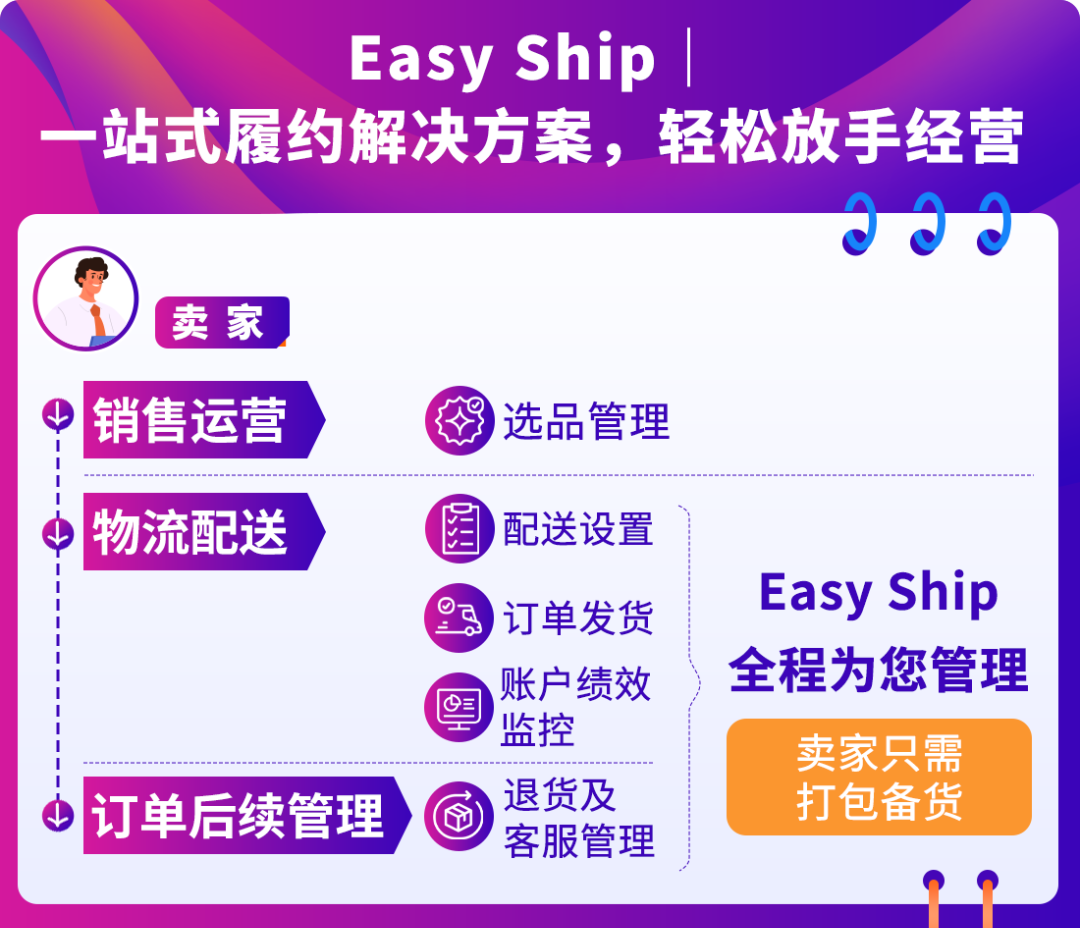 亚马逊即将推出的Easy Ship一站式履约解决方案,帮助卖家全程管理配送,您可以轻松放手经营,让运营变得更简单:
