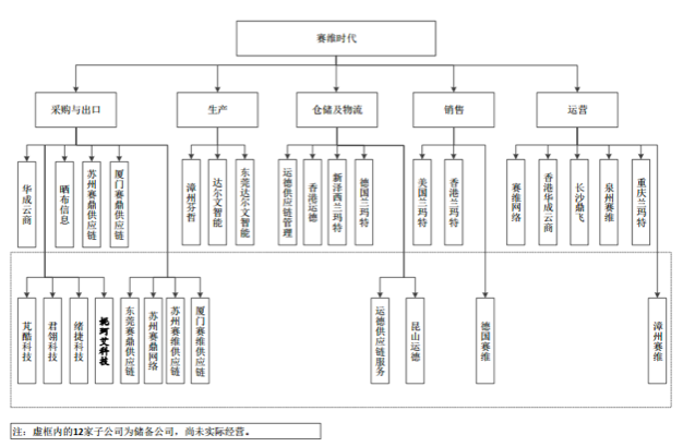 截至2021年12月,赛维时代公司主体架构如下,创始人及其家族成员合计持有公司80.13%的股权。