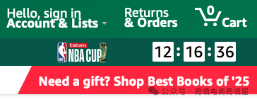 在主页右上角,亚马逊显示一个礼物提示,让消费者购买2025年最好的某类目产品作为礼物,例如图书。