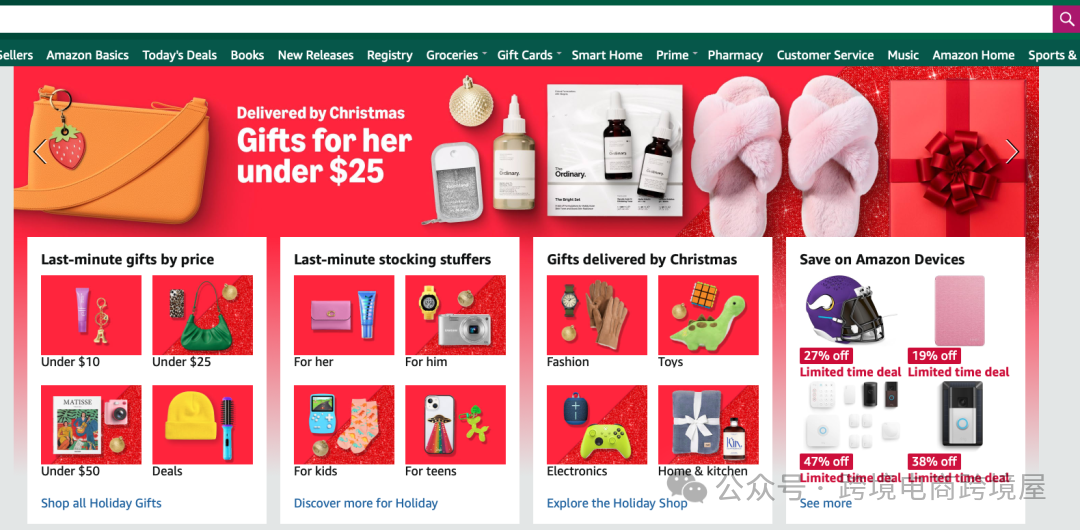 全年最大的黄金购物档期,圣诞节档期已经如火如荼。亚马逊不愧为全球最大的电商平台,页面中已开始上线不同的“倒计时”文案,推动消费者尽快为圣诞节礼物下单!