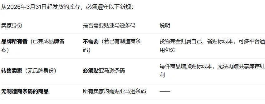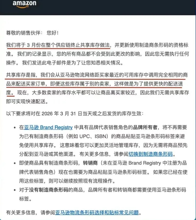 近日,亚马逊一封邮件在跨境圈刷屏:平台将于2026年3月31日起,全面终止供应链中的“共享库存”做法,并更新制造商条码使用标准。