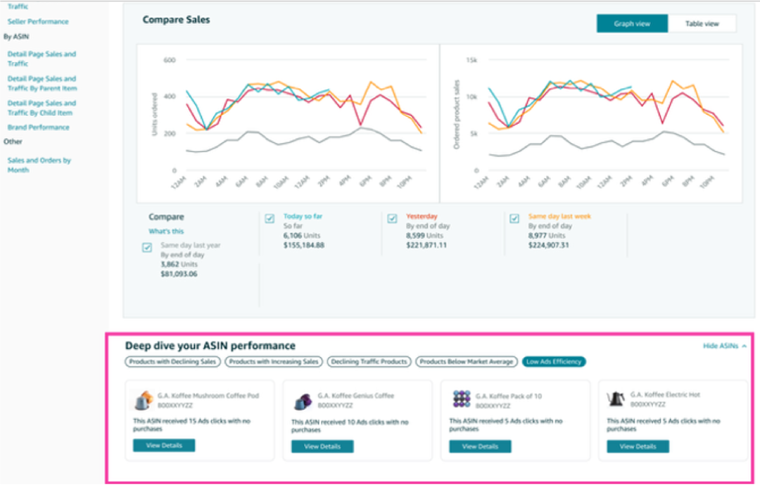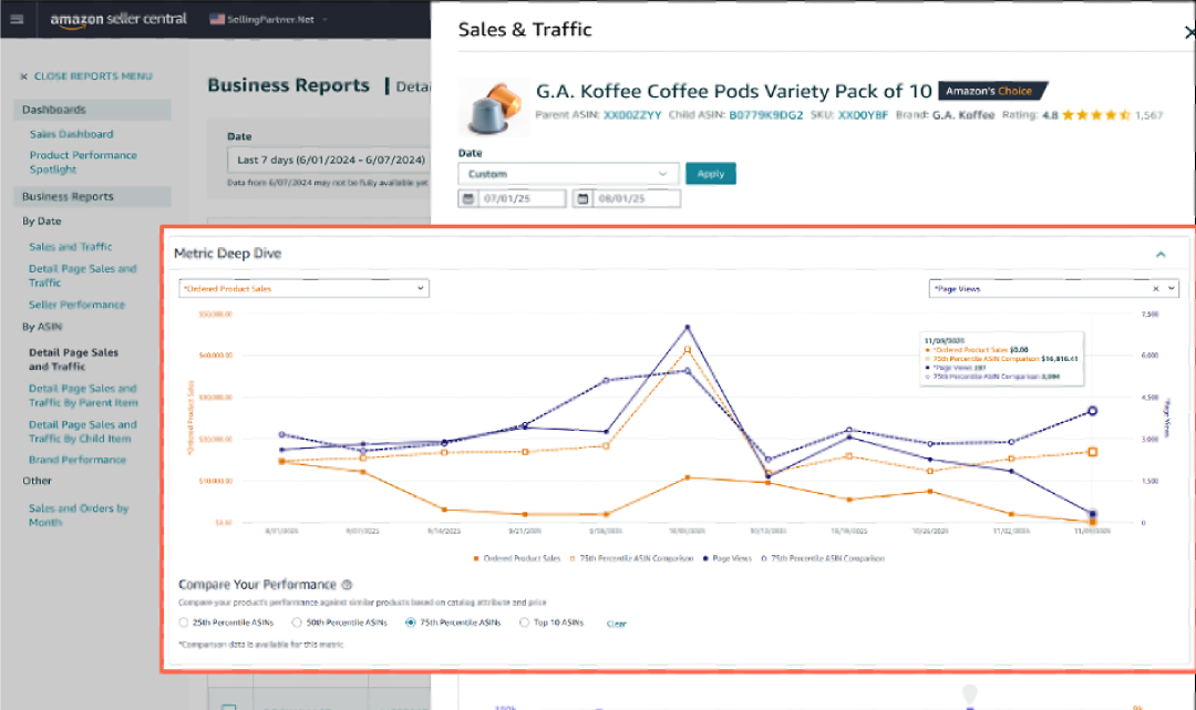 路径:卖家平台 > 报告 > 业务报告 > 销售控制面板>深入了解您的 ASIN 绩效
