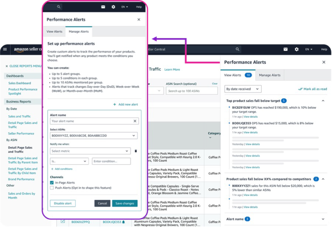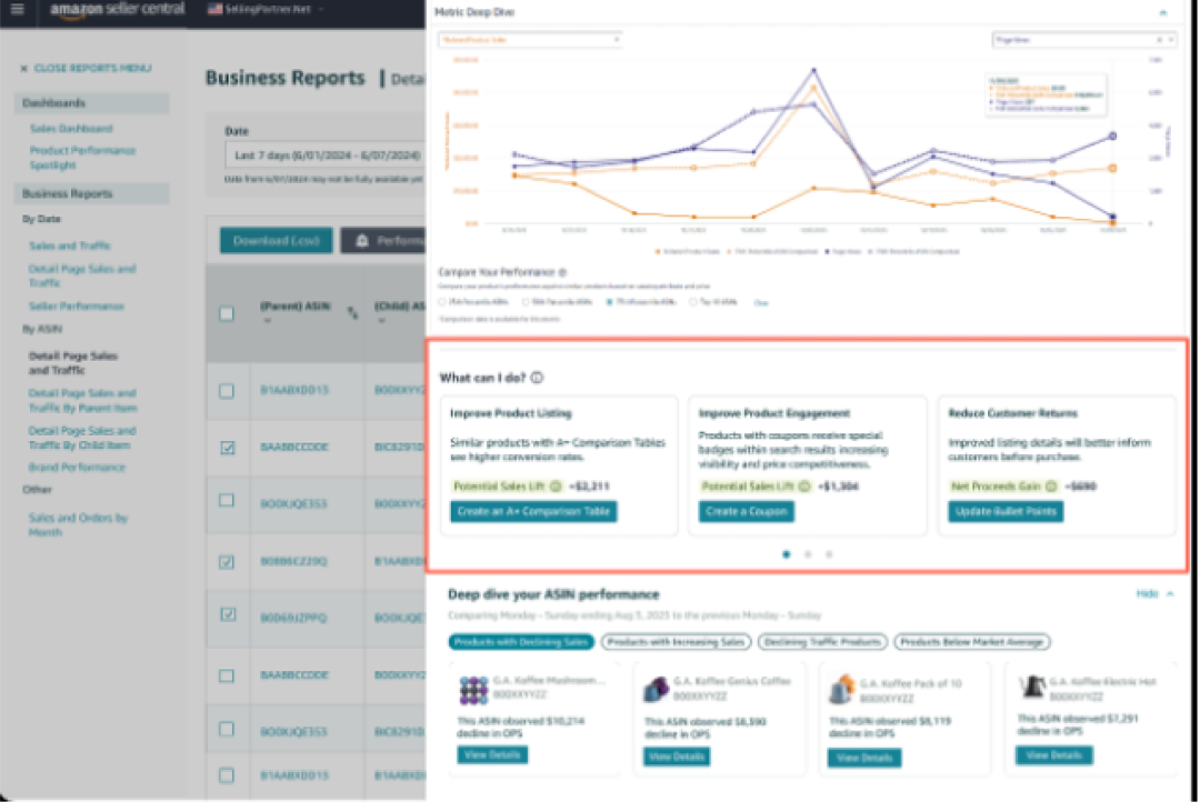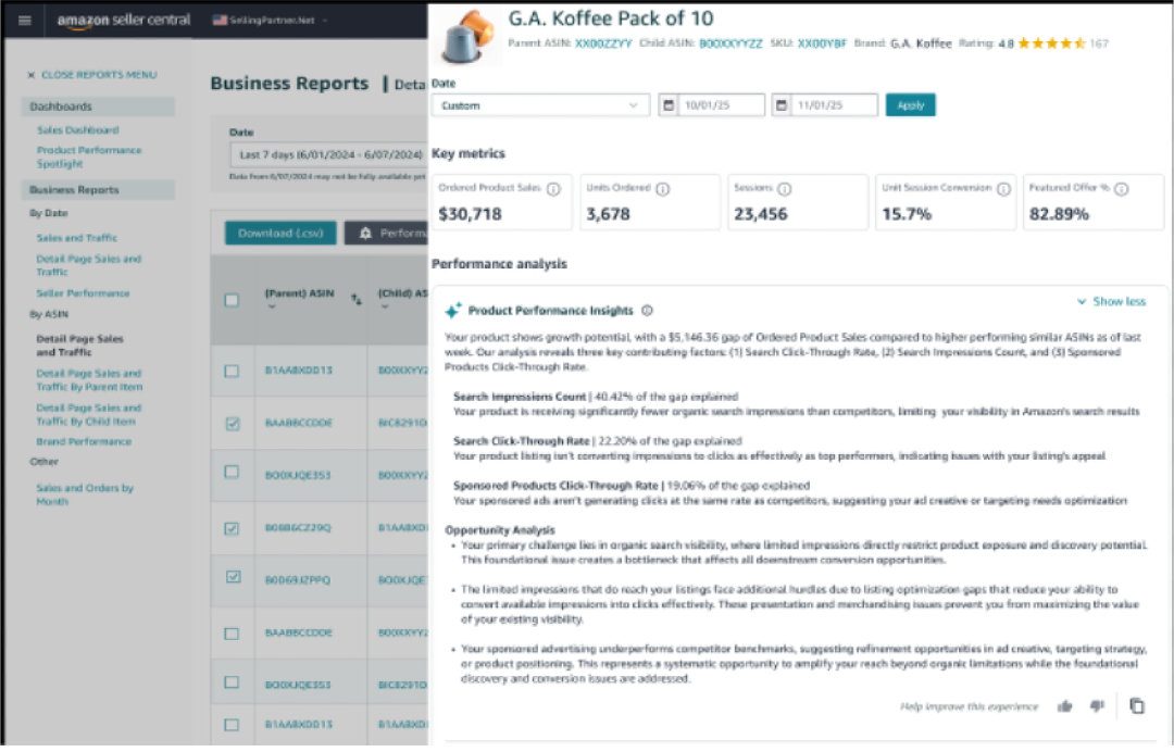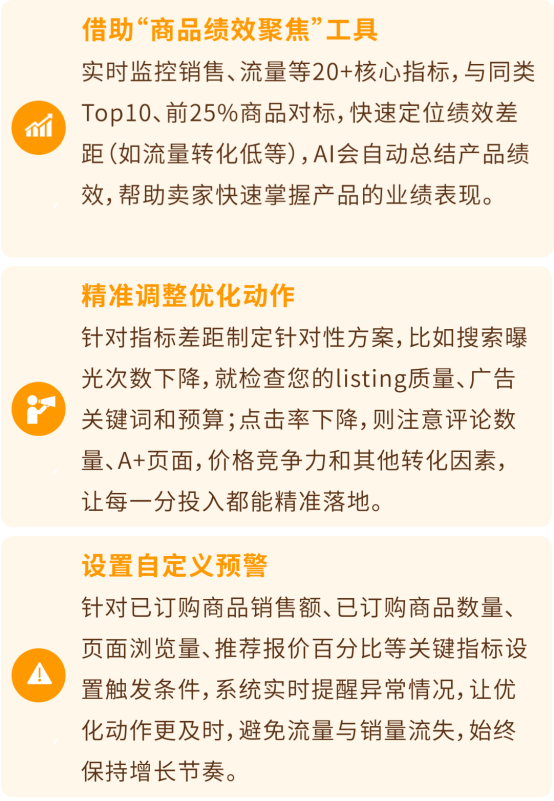 新品启动不是 “一锤子买卖”,通过实时数据监控与策略迭代,才能让增长势能持续放大。亚马逊推出了商品绩效聚焦(Product Performance Spotlight)工具,由AI驱动的ASIN绩效监控和优化个人助手,让卖家能够对 ASIN 的流量、转化等关键指标进行诊断和同类对标,并通过预警与建议快速识别风险、放大优势,把每一次新品尝试沉淀为可复制的增长经验。