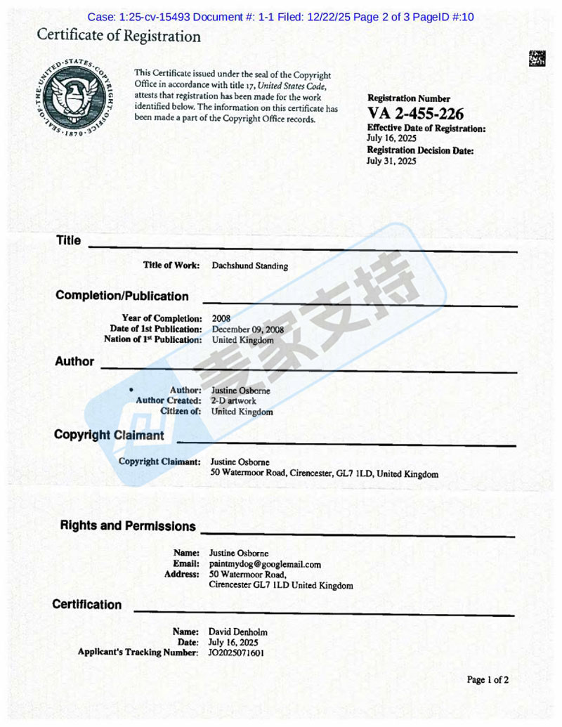 本案是keith律所代理Justine Osborne,针对其于2025年7月16日获得美国版权认证的站立的腊肠犬版权作品发起的版权维权案件,涉案版权号为:VA 2-455-226。该作品被广泛用于站立的腊肠犬、陶瓷用品以及手工装饰画等多个领域,未经授权使用,则会面临TRO冻结风险!目前该案件处于前期立案阶段,暂未获批TRO临时限制令,有上架过相似产品的卖家需尽快排查下架,并做好进一步应对措施,关注我们跟进案件后续进展!