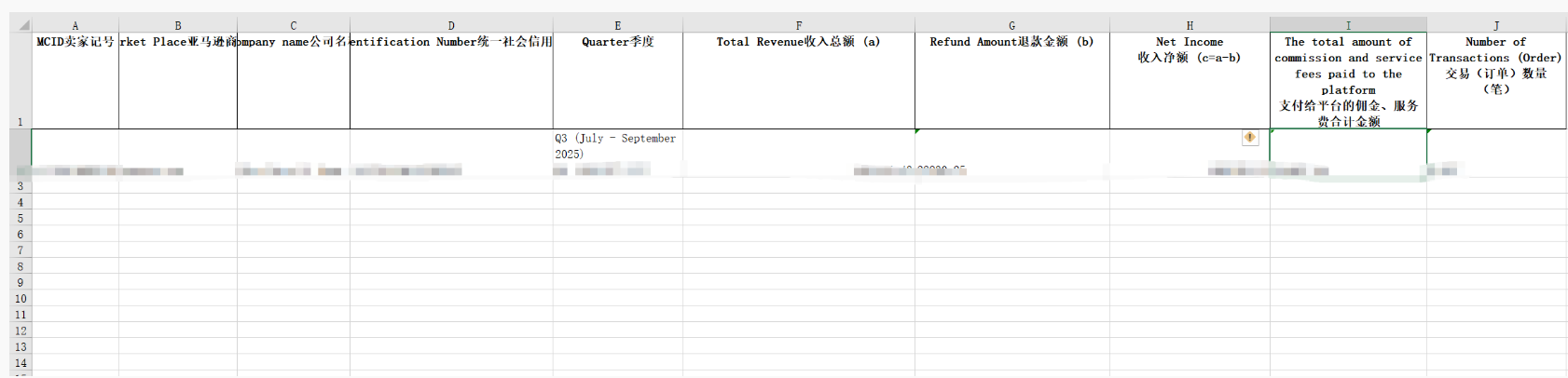 邮件内容直截了当:亚马逊已将卖家2025年第三季度(7月-9月)的交易数据向我国税局报送,其中包含“卖家记号、亚马逊站点、公司名称、统一社会信用代码/纳税人识别号、季度、收入总额、退款金额、收入净额、支付给平台的佣金服务费合计金额、交易(订单)数量”这10个维度的信息。