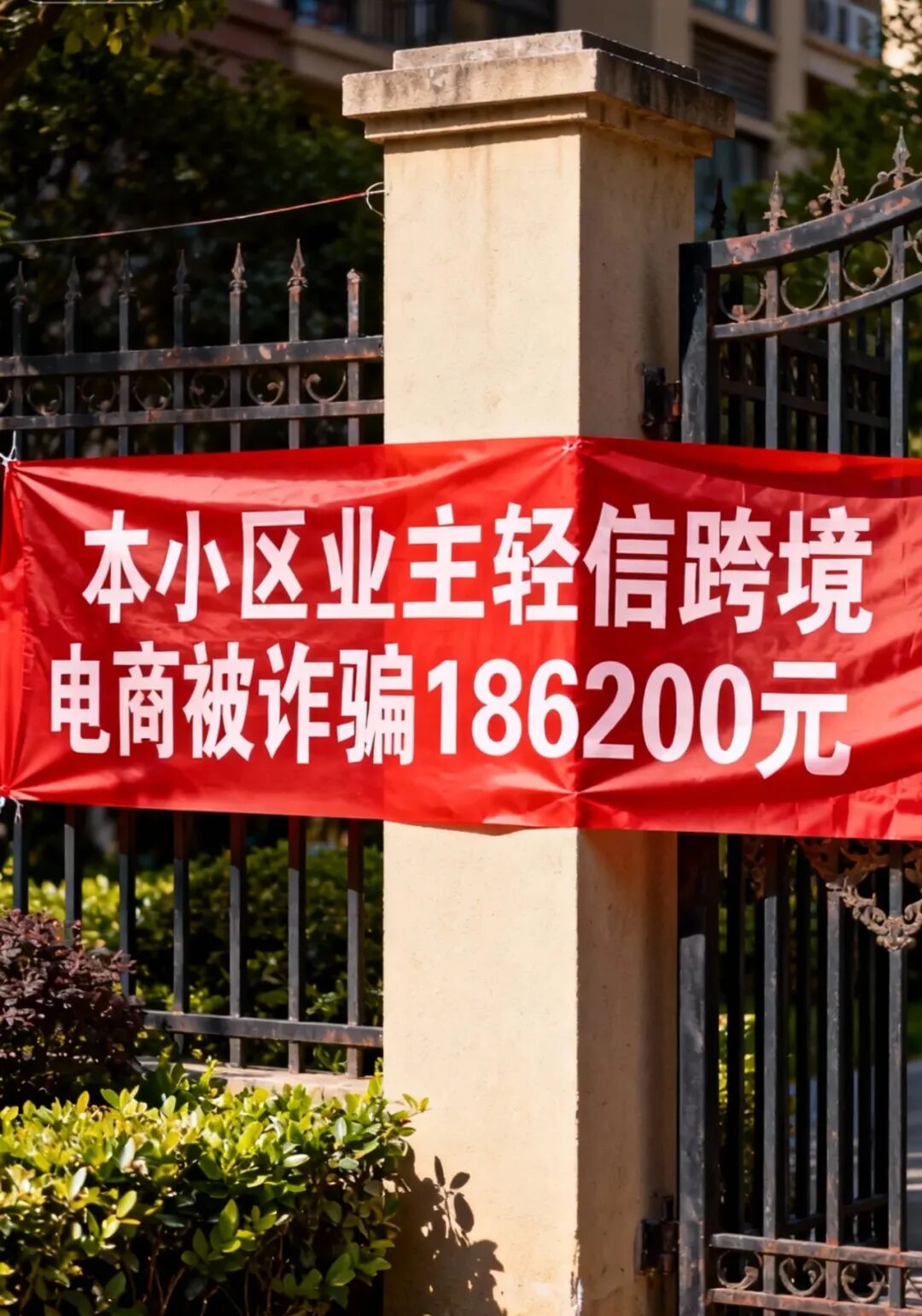红色的长条形横幅上写着醒目的白色字体:本小区业主因轻信跨境电商被诈骗186200元。